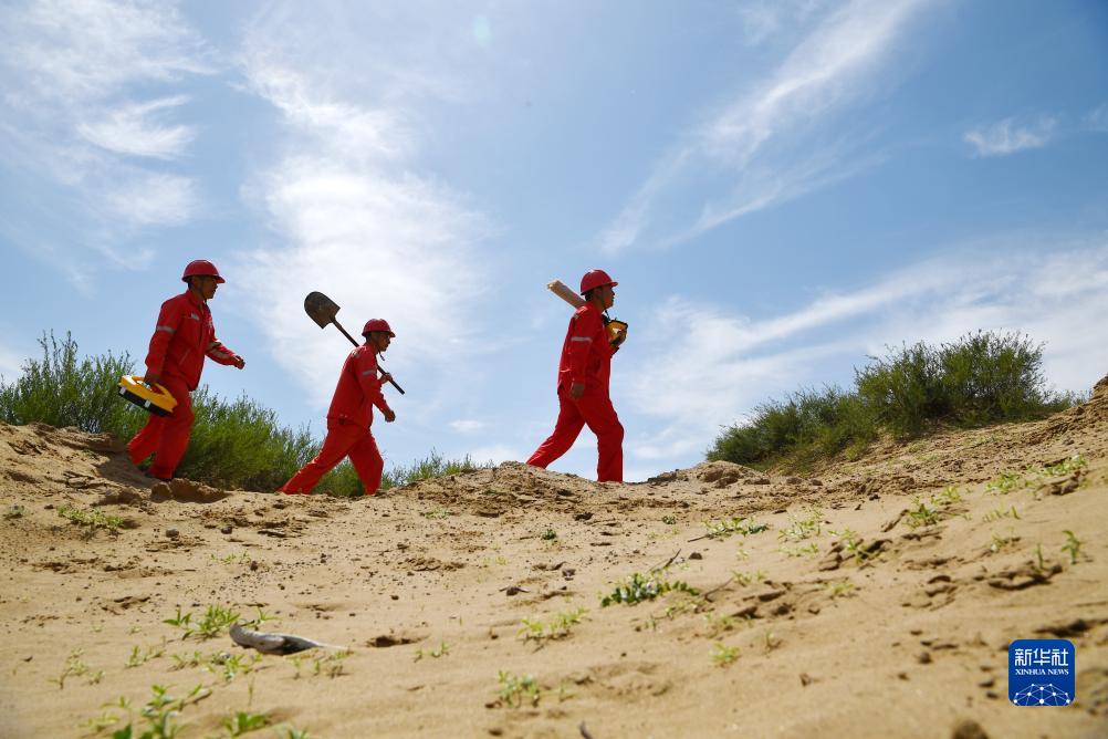 巡線隊員在巡線時穿越沙漠區域(7月23日攝)。