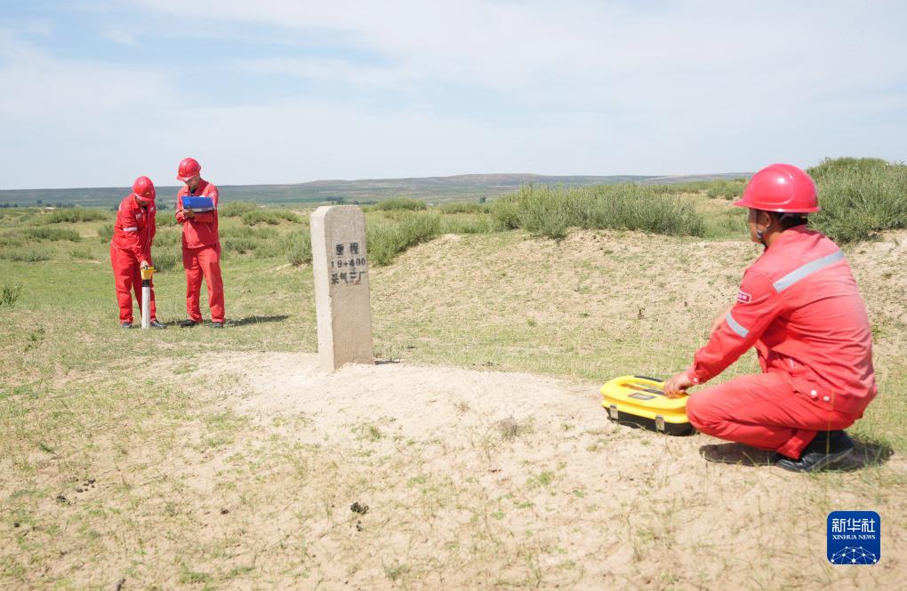 巡線隊員在巡線時利用探測儀檢測管線埋藏深度(7月23日攝)。