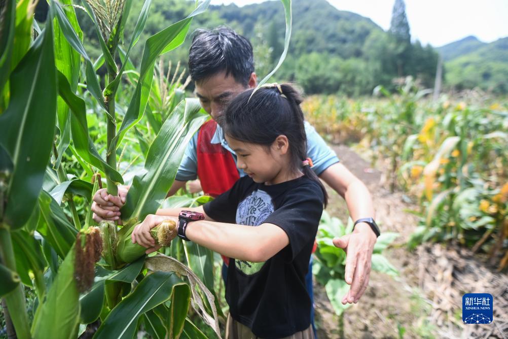 7月25日,在諸暨市馬劍鎮(zhèn)狀元村,暑托班的孩子們?cè)谵r(nóng)田里采收玉米,體驗(yàn)農(nóng)事。