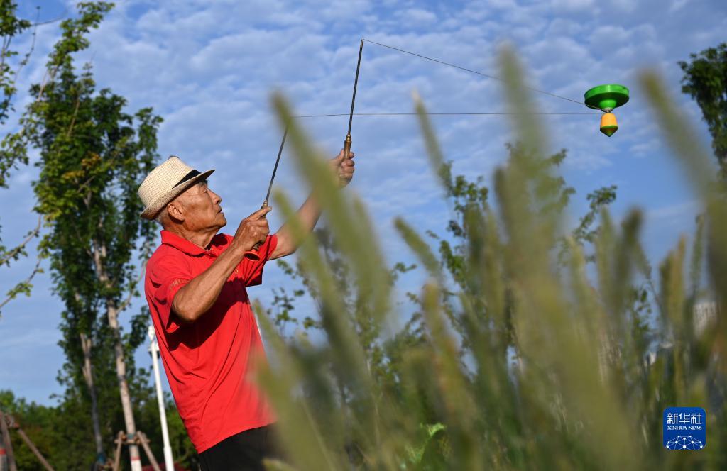 7月25日,市民在白溝新城一處“口袋公園”抖空竹。