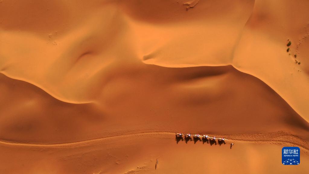 7月20日,游客在中衛市沙坡頭景區騰格里沙漠體驗沙漠騎駱駝(無人機照片)。