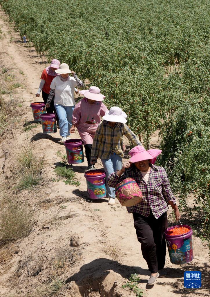 7月21日,采摘女工在中衛市沙坡頭區興仁鎮搬運枸杞。