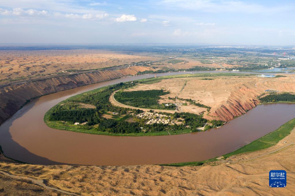 7月19日拍攝的植被覆蓋的中衛(wèi)市黃河沿岸(無人機(jī)照片)。