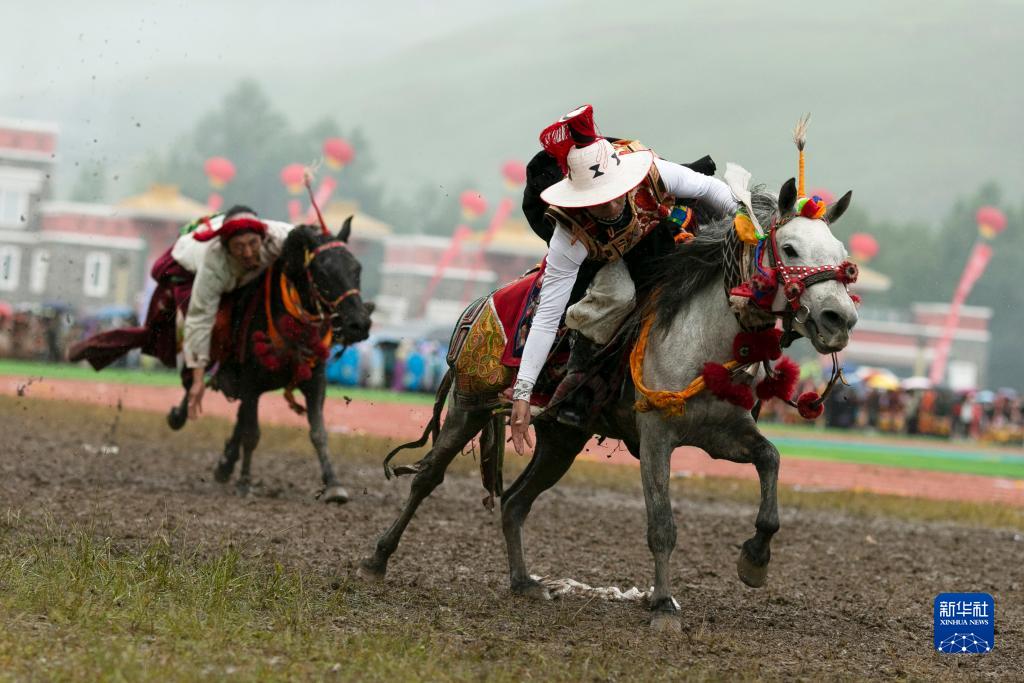 7月25日在玉樹(shù)賽馬場(chǎng)拍攝的跑馬拾哈達(dá)表演。