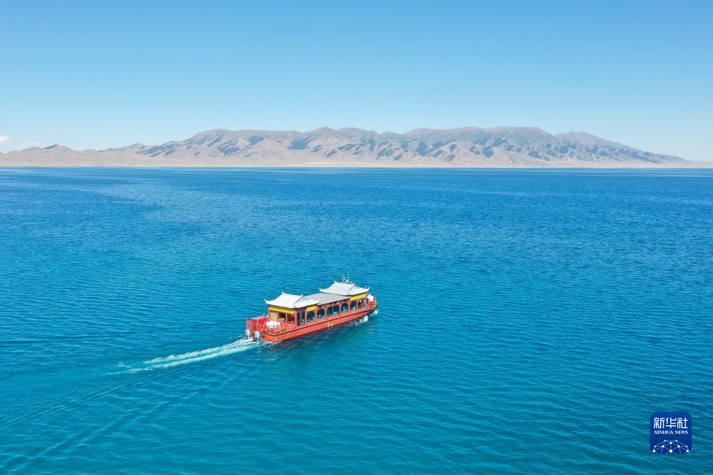 7月25日,游客乘坐游船在新疆賽里木湖游覽(無人機照片)。