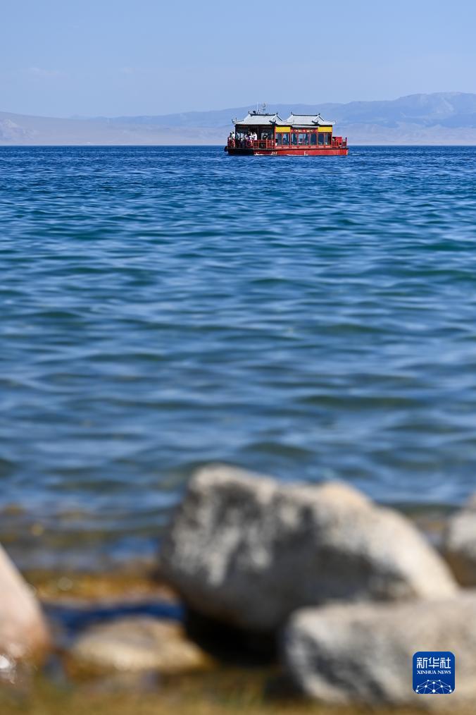 7月25日,游客乘坐游船在新疆賽里木湖游覽。