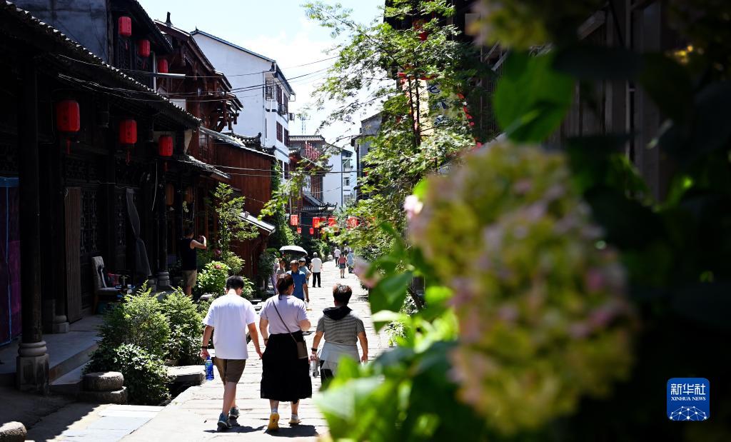游客在陜西省漢中市留壩縣老街上游玩(7月25日攝)。