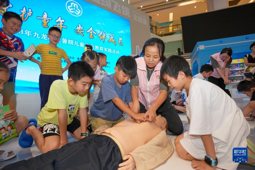 7月25日,在重慶市九龍坡區(qū)楊家坪街道一商場的預(yù)防溺水安全教育社區(qū)服務(wù)點,青少年在巾幗志愿者的指導(dǎo)下體驗心肺復(fù)蘇操作技能。