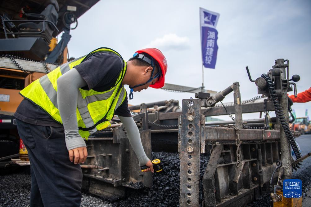7月25日,在衡永高速路面工程施工現場,工人在測量瀝青溫度。