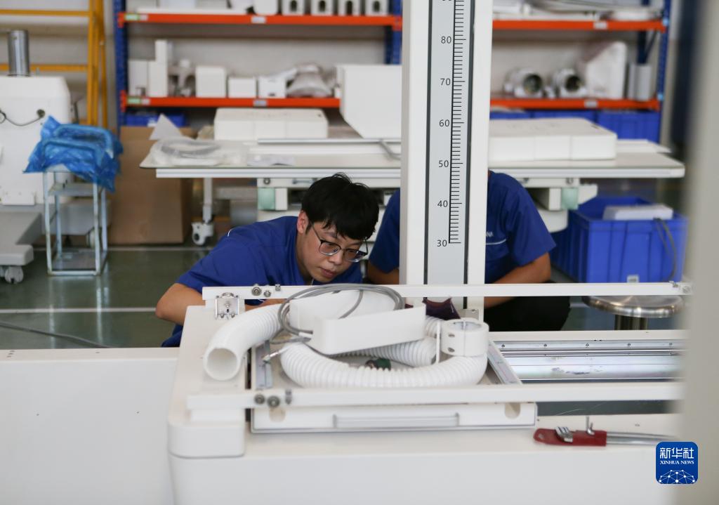 7月25日,在位于淄博市高新區的山東新華醫療器械股份有限公司,工作人員在車間組裝醫療設備。