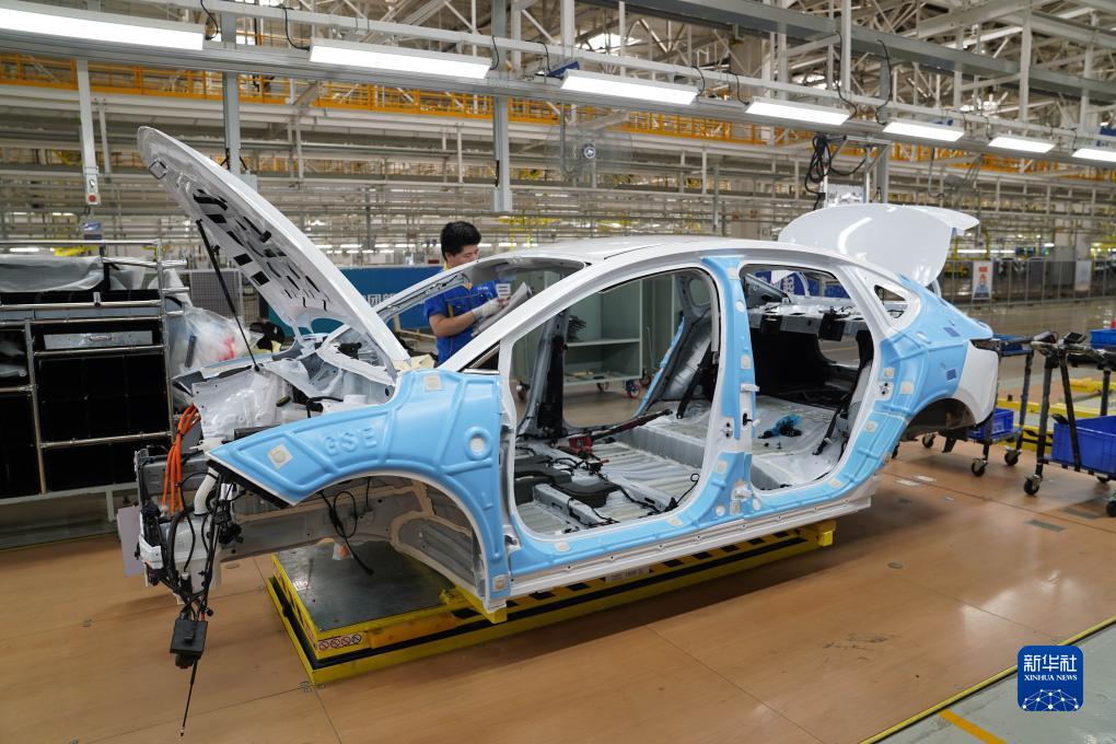 在位于江西省南昌市經(jīng)開區(qū)的江鈴集團(tuán)新能源汽車有限公司生產(chǎn)基地車間內(nèi),工人在生產(chǎn)線上作業(yè)(7月18日攝)。新華社記者 周密 攝