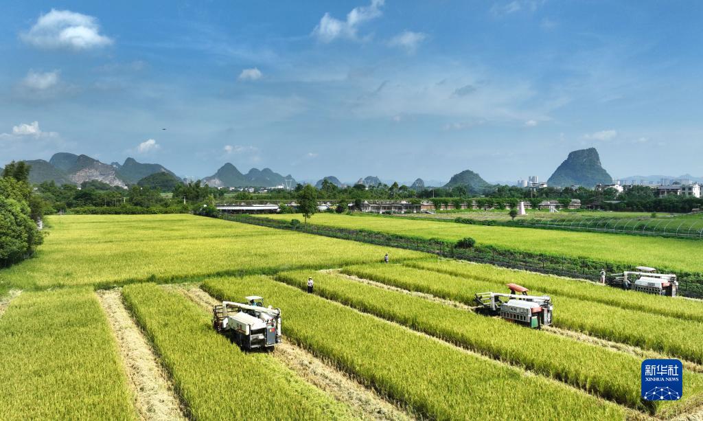 柳州市柳江區(qū)是廣西重要的糧食生產(chǎn)基地之一。連日來(lái),柳江區(qū)種植的12.2萬(wàn)畝早稻陸續(xù)進(jìn)入成熟收獲期,當(dāng)?shù)剞r(nóng)機(jī)部門(mén)組織收割機(jī)保障早稻收割的同時(shí),還通過(guò)開(kāi)展水稻機(jī)收減損技能比武等方式,引導(dǎo)廣大農(nóng)民和農(nóng)機(jī)手在生產(chǎn)實(shí)踐中精操作、比技能,保障夏糧豐收。新華社發(fā)(黎寒池 攝)