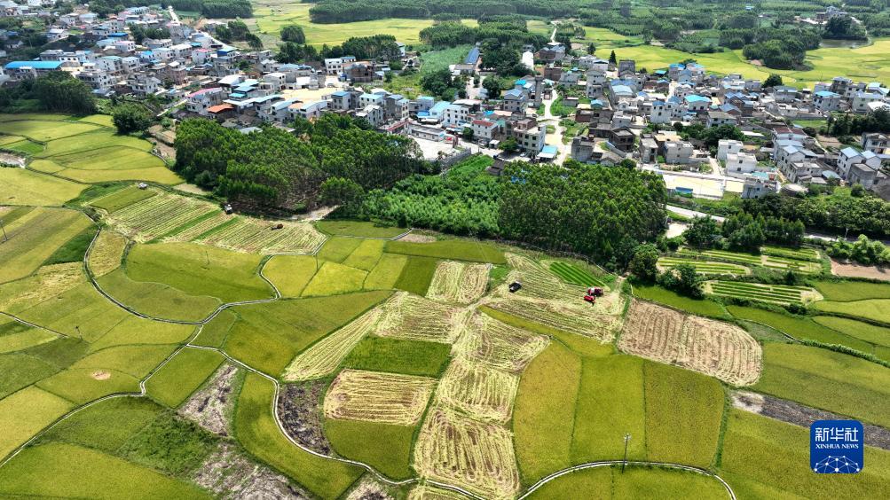 7月25日,收割機在柳州市柳江區穿山鎮林寺村的稻田中收割早稻(無人機照片)。新華社發(黎寒池 攝)