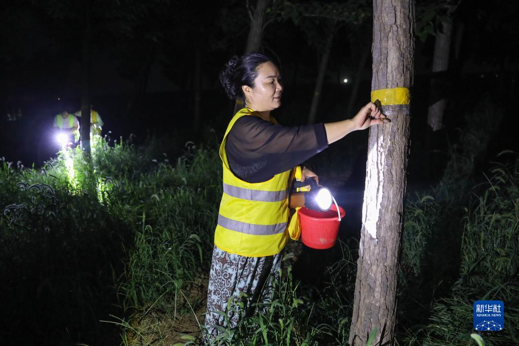 7月24日晚,在寶豐縣鬧店鎮連店村一處林下金蟬養殖基地,工作人員在采收金蟬。新華社發(何五昌攝)