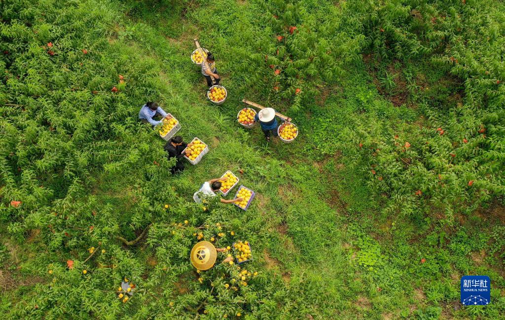 7月25日,果農在貴州省玉屏侗族自治縣朱家場鎮混寨村黃桃基地采收黃桃(無人機照片)。新華社發(胡攀學 攝)