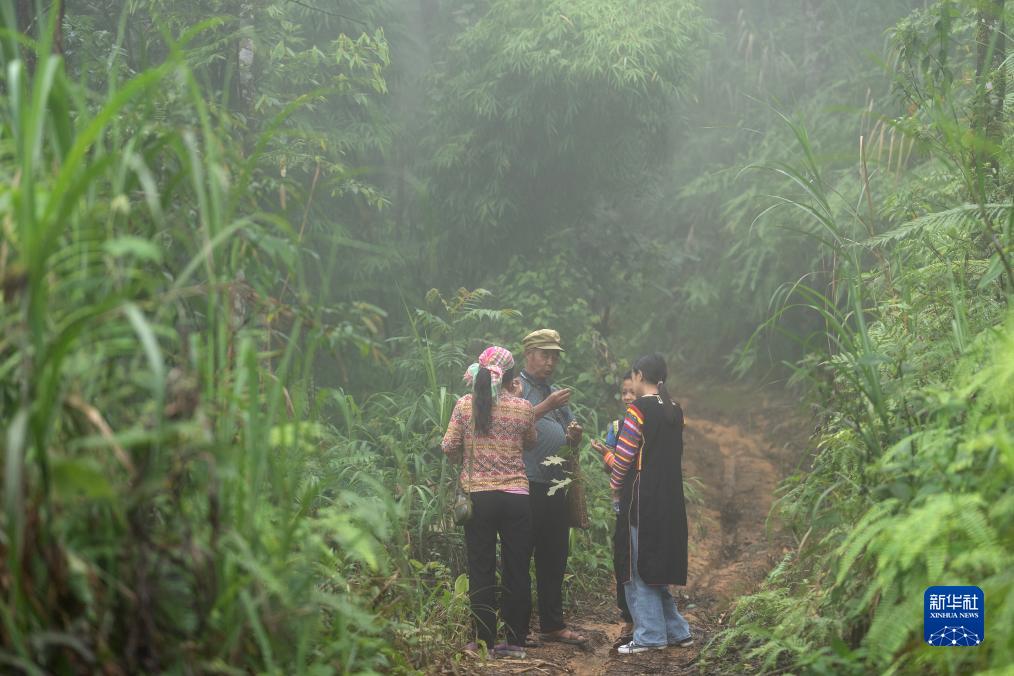 7月23日,張普忠(左二)在樹林中邊走邊說,向孩子們介紹野果、草藥等知識。新華社記者 費茂華 攝