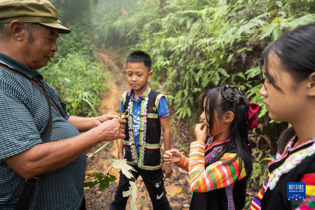 7月23日,張普忠(左一)摘野果給孩子們吃。新華社記者 費茂華 攝