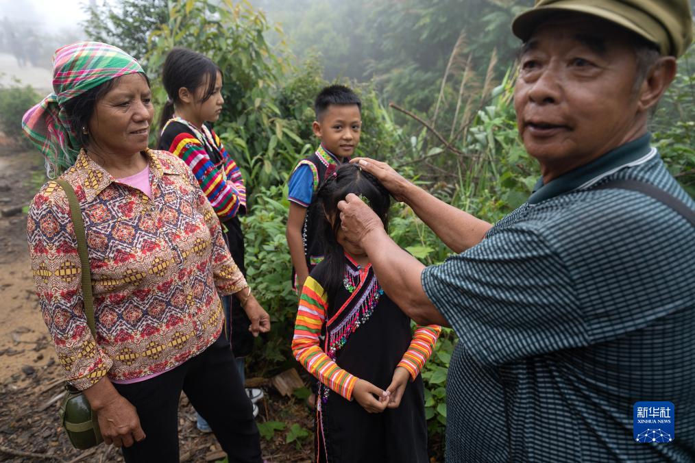 7月23日,張普忠(右一)把揉碎的草藥“納次”放到小孫女張麗紅的額頭,問她有什么感覺。新華社記者 費茂華 攝