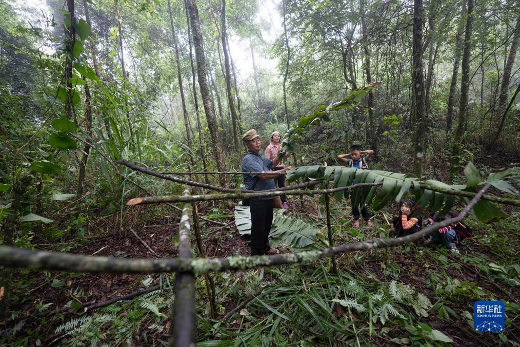 7月23日,張普忠(左一)和老伴王素英在搭建芭蕉葉棚子。新華社記者 費茂華 攝