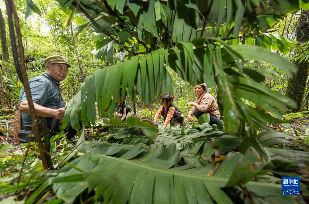 7月23日,張普忠(左一)和老伴王素英在鋪設芭蕉葉棚子的“地板”。新華社記者 費茂華 攝