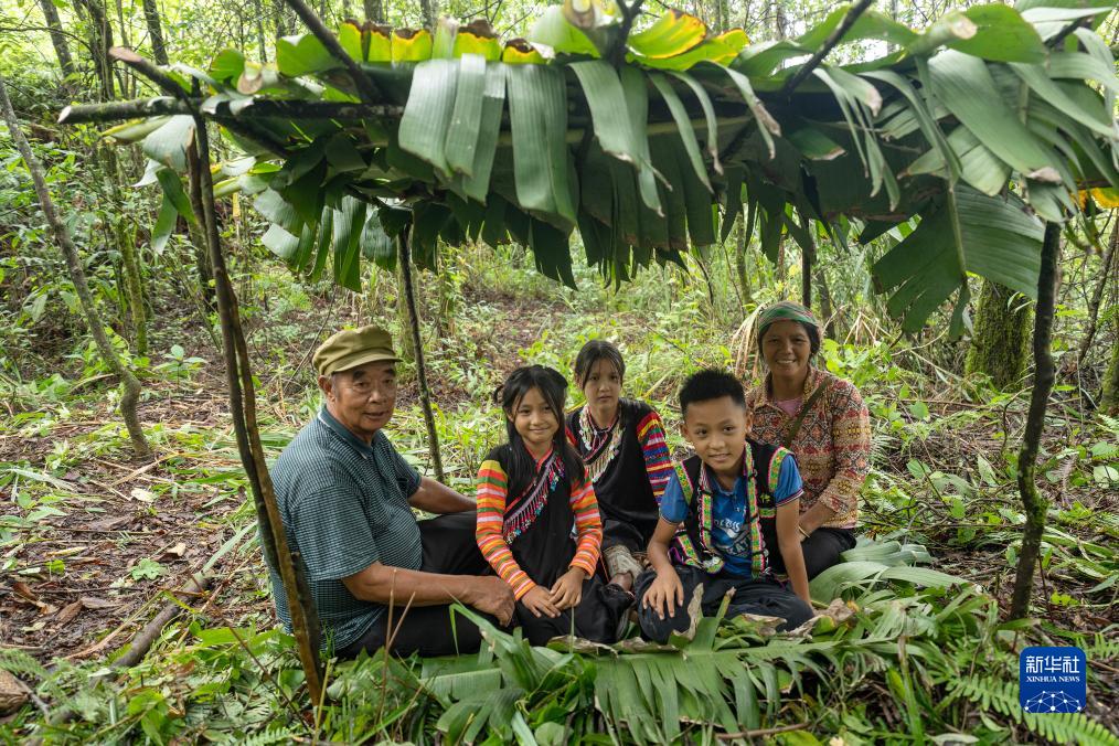 7月23日,張普忠和家人在芭蕉葉棚子里合影,從左至右為張普忠、小孫女張麗紅、大孫女張英、孫子張偉軍和老伴王素英。新華社記者 費茂華 攝