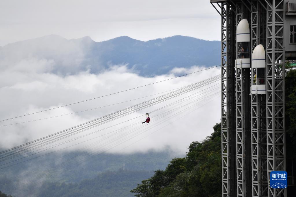 7月25日,游客在張家界大峽谷景區體驗高空滑索。