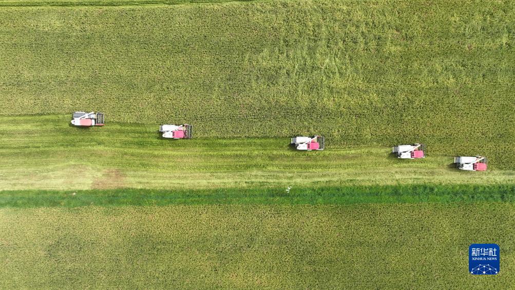 在江西省南昌市新建區(qū)聯(lián)圩鎮(zhèn)連前村,多臺聯(lián)合收割機(jī)在田間收割早稻(7月24日攝,無人機(jī)照片)。