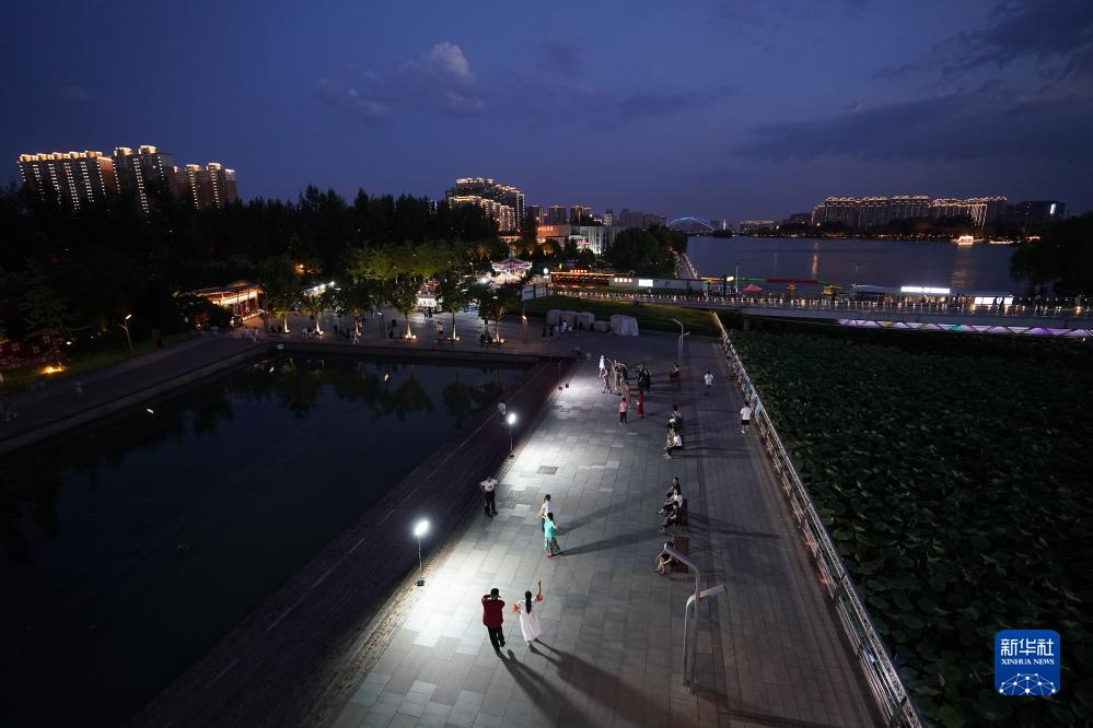 人們在太原市汾河景區跳舞(7月25日攝)。