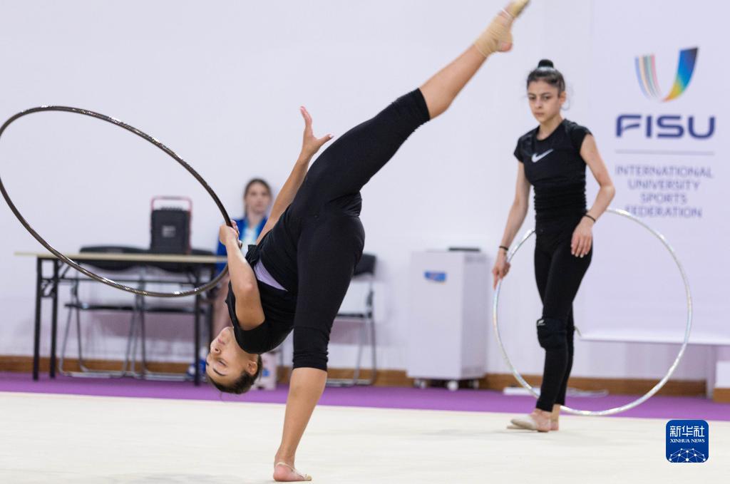 7月25日,阿塞拜疆大學生藝術體操隊的選手在成都體育學院體操館訓練。