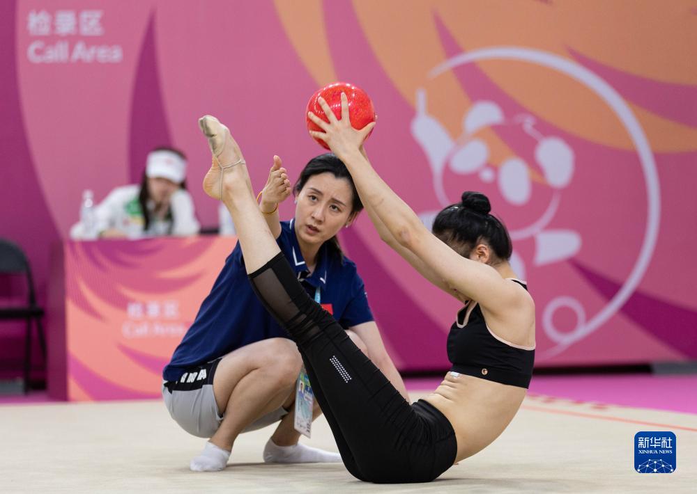 7月25日,成都大運會中國大學生藝術體操隊集體項目主教練任爽(左)在成都體育學院體操館指導隊員訓練。