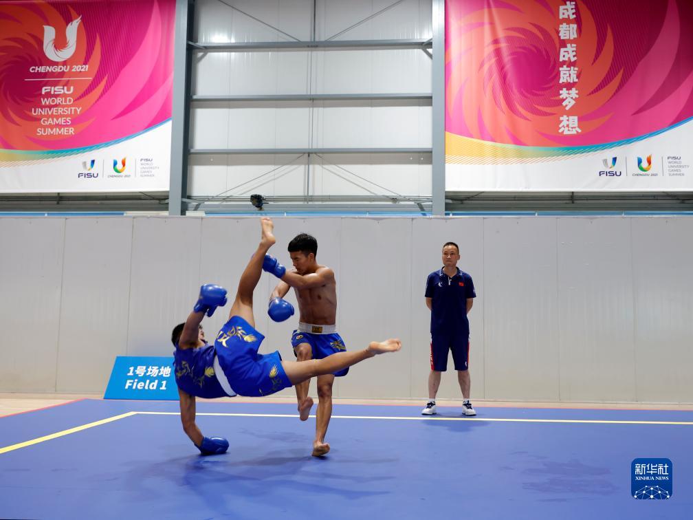 7月25日,參加第31屆世界大學(xué)生夏季運動會武術(shù)散打比賽的中國選手在成都城北體育館訓(xùn)練。
