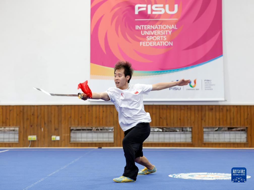 7月25日,參加第31屆世界大學生夏季運動會武術比賽的中國選手金哲典在成都城北體育館訓練。