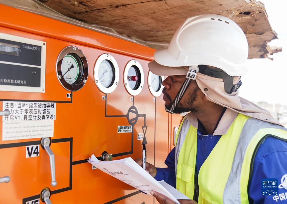 6月12日,大衛(wèi)在肯尼亞馬查科斯郡孔扎變電站建設(shè)工地檢查設(shè)備運(yùn)行情況。