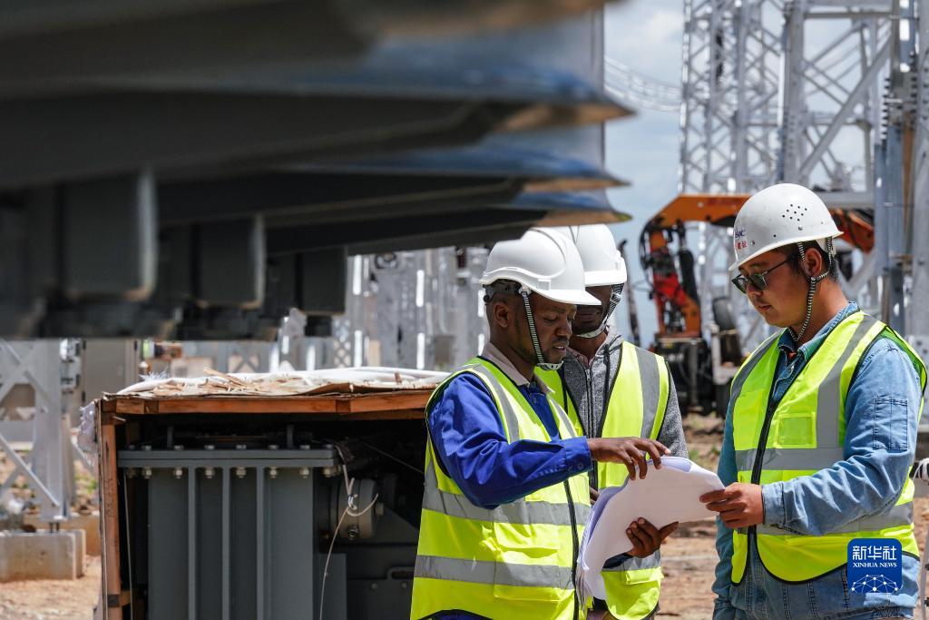 5月5日,在肯尼亞馬查科斯郡孔扎變電站建設(shè)工地,大衛(wèi)(左)與同事溝通變壓器安裝情況。