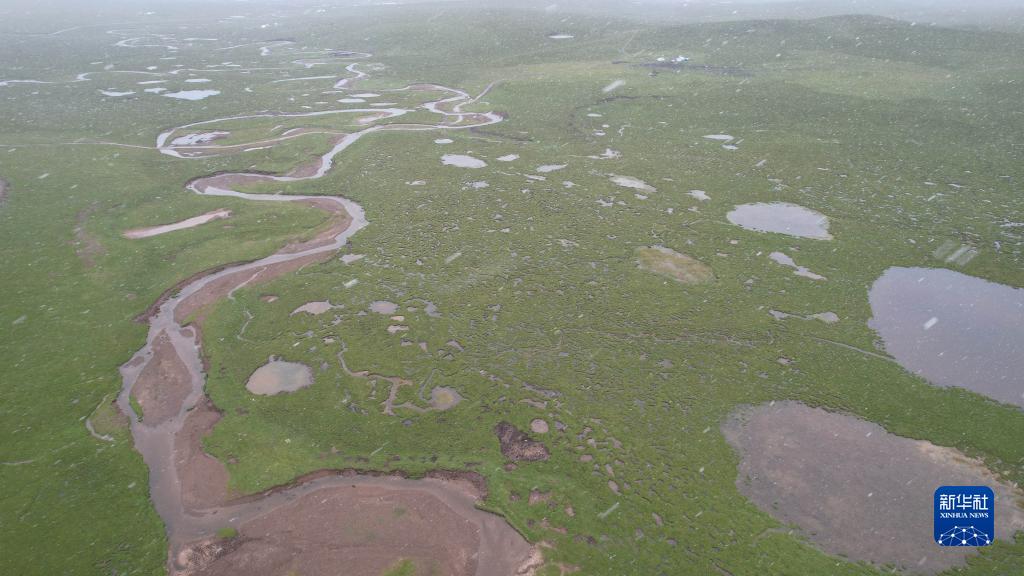 風雪彌漫中的當曲濕地(7月24日攝,無人機照片)。