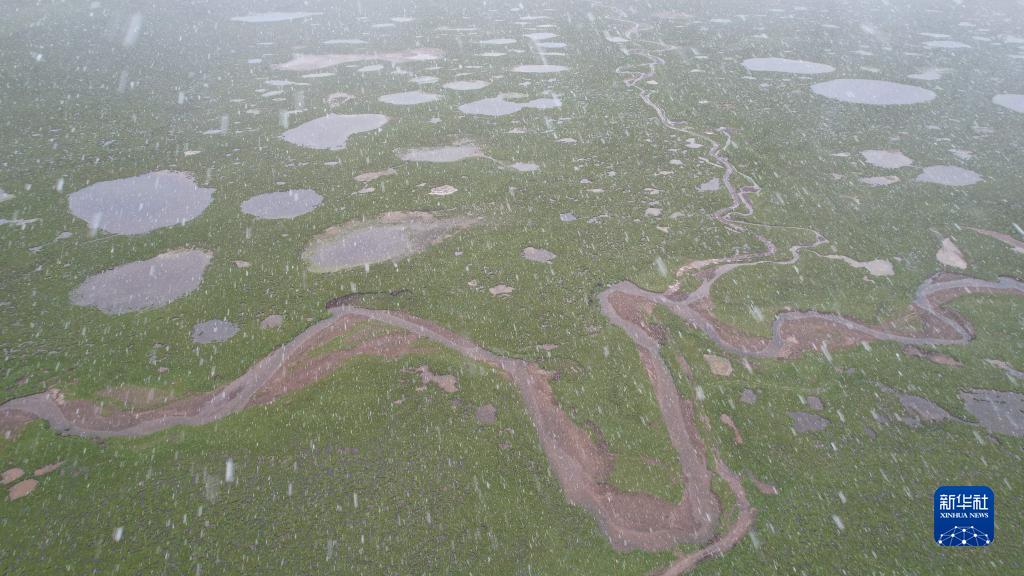 風雪彌漫中的當曲濕地(7月24日攝,無人機照片)。