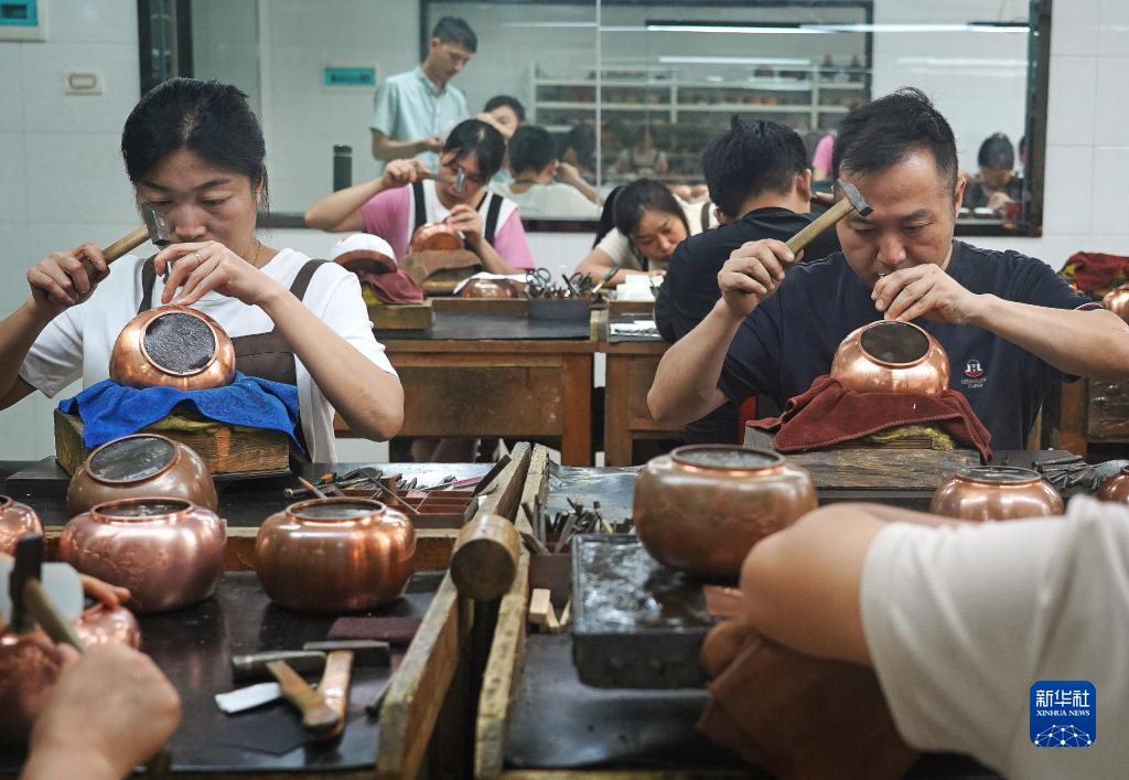 在位于江西省貴溪市的江西中鼎金屬工藝有限公司的車間里,匠人們在雕刻銅壺(7月13日攝)。