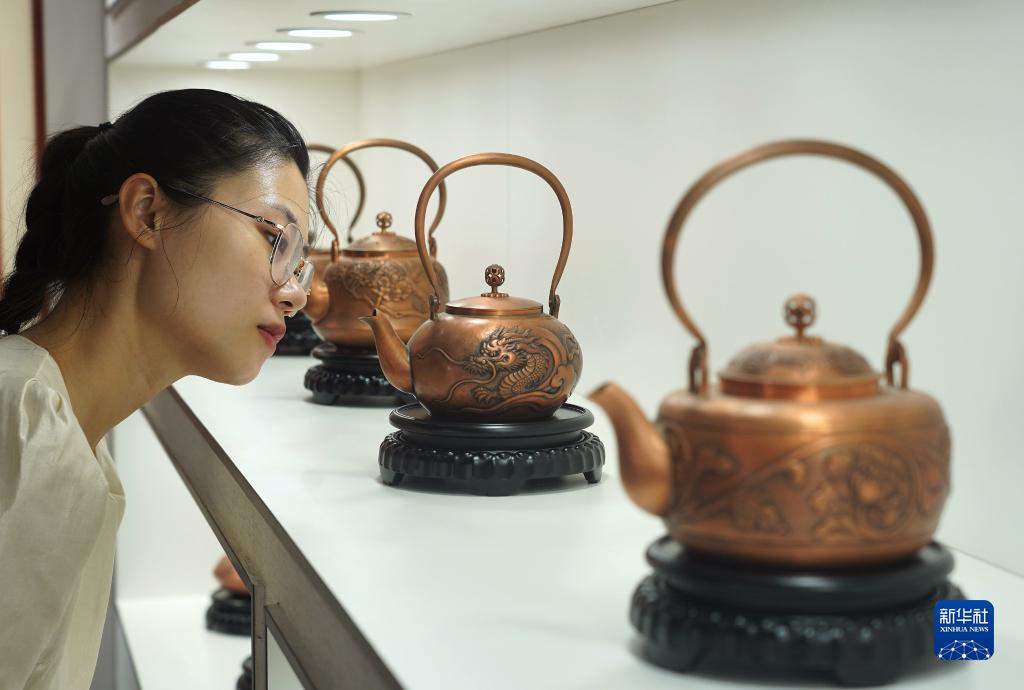 參觀者在江西中鼎金屬工藝有限公司的展廳里觀賞銅壺工藝品(7月13日攝)。