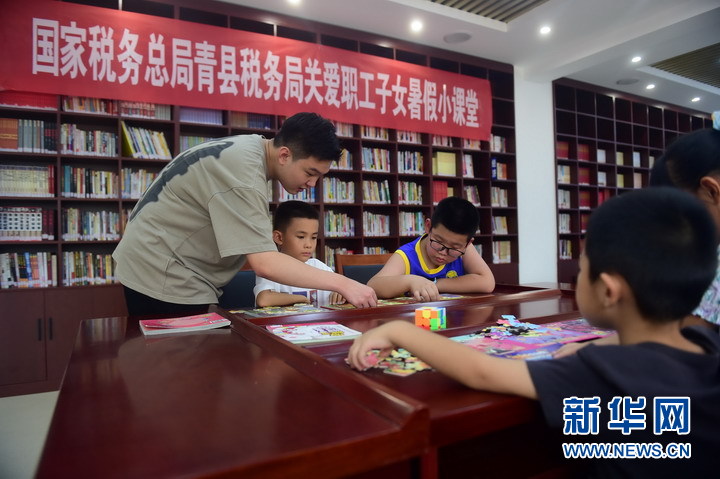 暑假期間,國家稅務總局河北青縣稅務局在機關讀書室舉辦關愛職工子女暑假小課堂,招募返鄉大學生組建小課堂志愿服務隊伍,根據孩子們的興趣活動開展繪畫、手工制作、安全教育、心理交流等課程。新華網發(張悅 攝)
