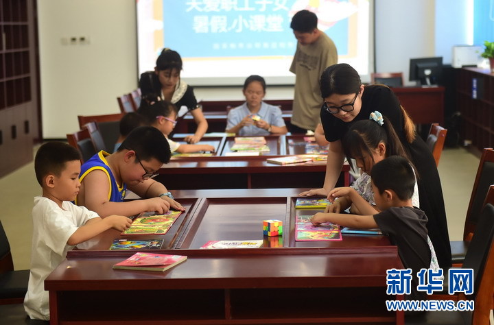 志愿者在河北青縣稅務局組織的關愛職工子女暑假小課堂上對孩子們進行輔導。新華網發(張悅 攝)