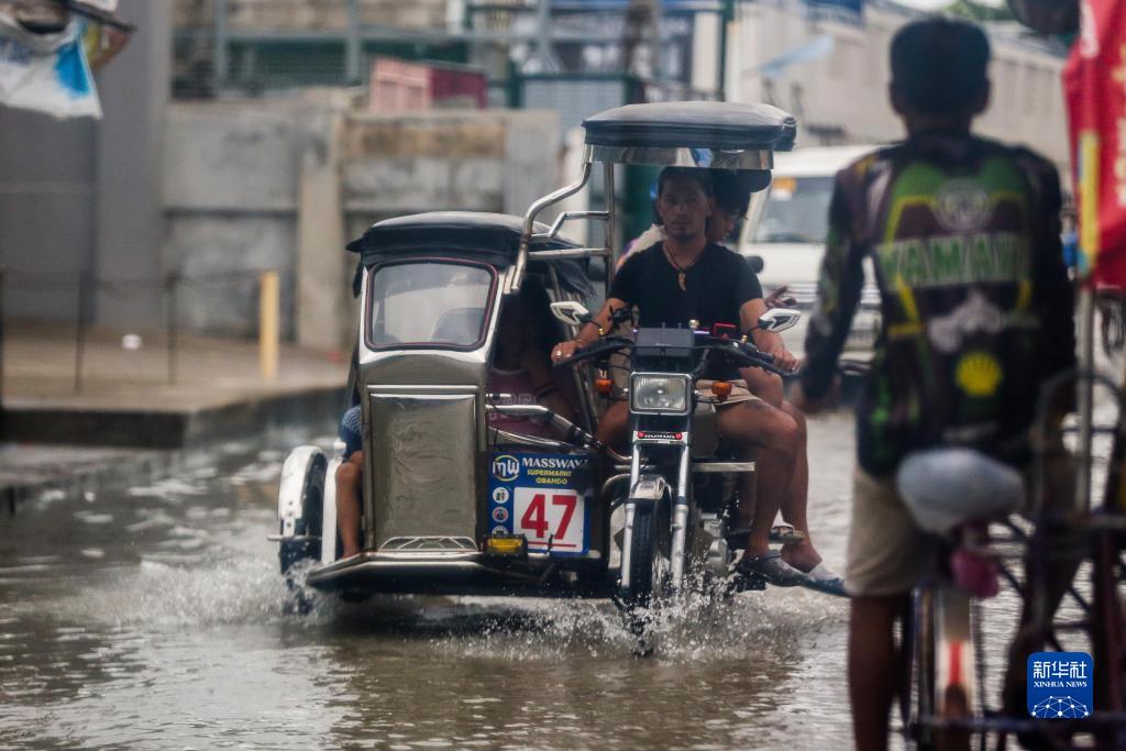 7月26日,人們在菲律賓馬拉邦一處積水的街道涉水而行。