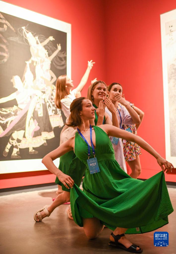 在新疆美術(shù)館,索菲婭(前)和隊友們在一幅名為《畬族歡歌》的畫作前留影(7月20日攝)。
