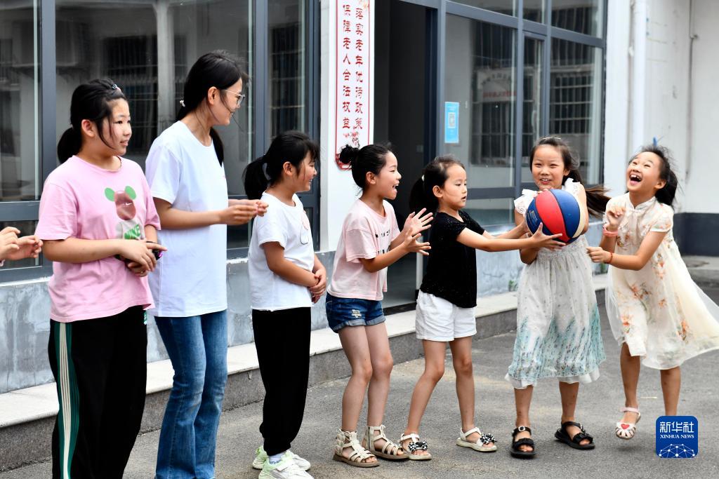 7月26日,在莒縣龍山鎮東樓村“小草學堂”,孩子們在哈爾濱理工大學志愿者的帶領下做游戲。