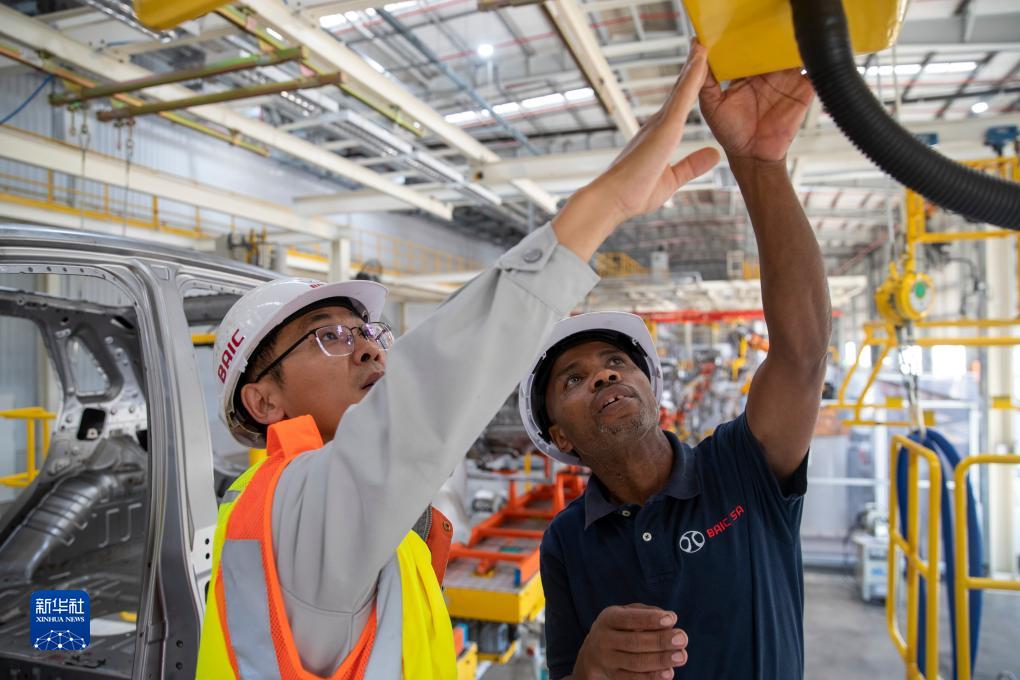 5月9日,在南非東開普省北汽南非工廠,邦加尼(右)與中國同事方龍在焊裝車間內工作。