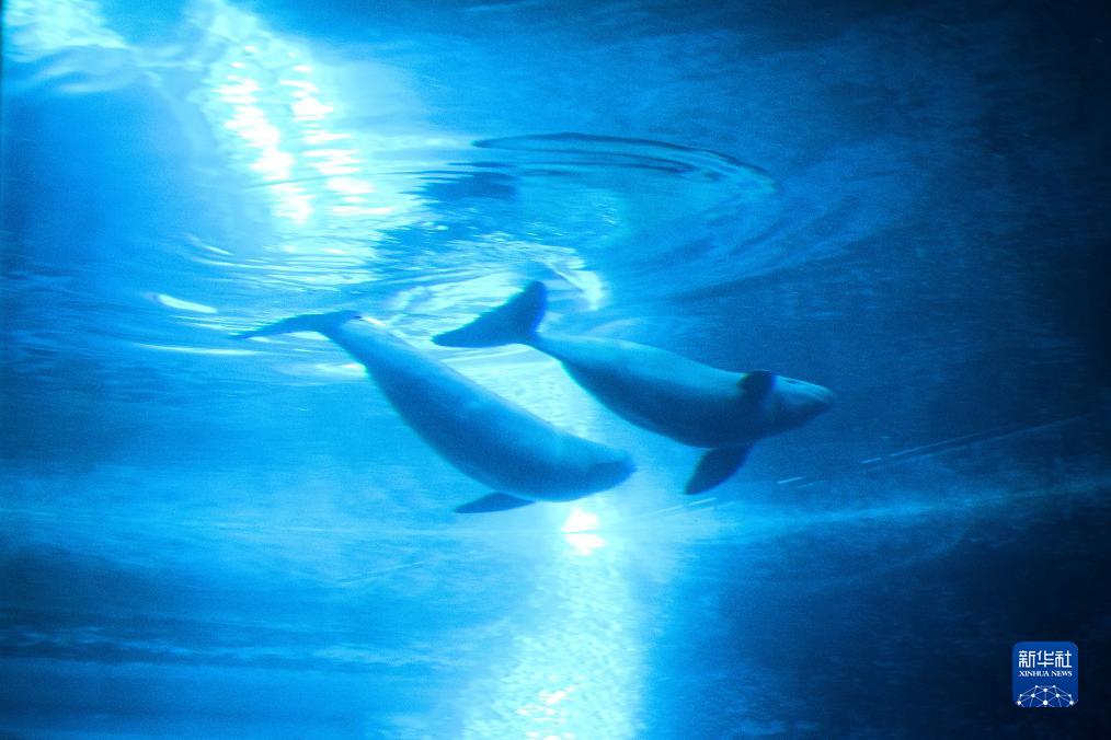 7月12日,兩頭長江江豚在白鱀豚館水中游動。