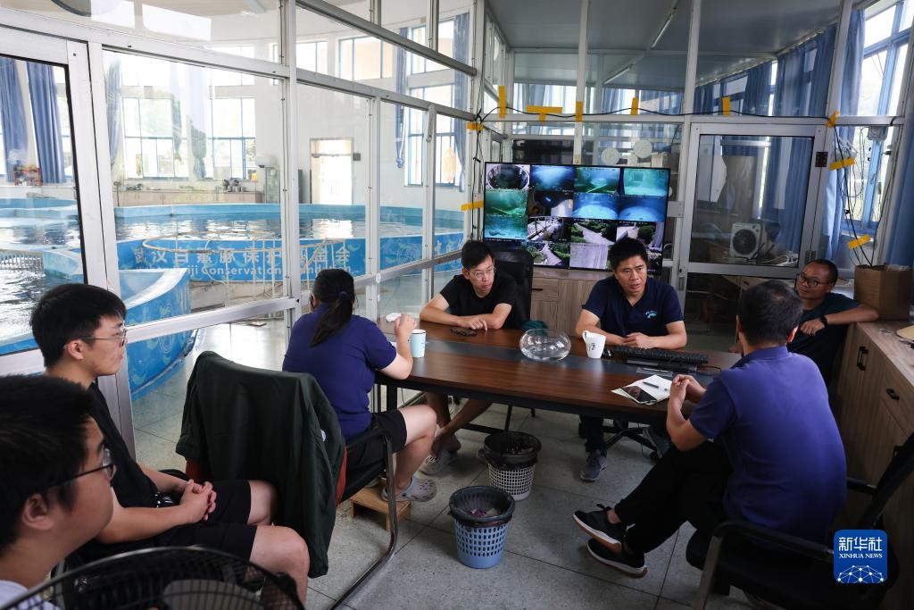7月12日,中國科學(xué)院水生生物研究所白鱀豚館訓(xùn)練員在討論長江江豚喂養(yǎng)方案。