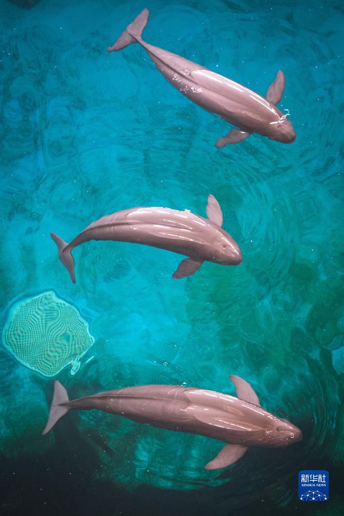 6月29日,三頭長(zhǎng)江江豚在白鱀豚館水中游動(dòng)。