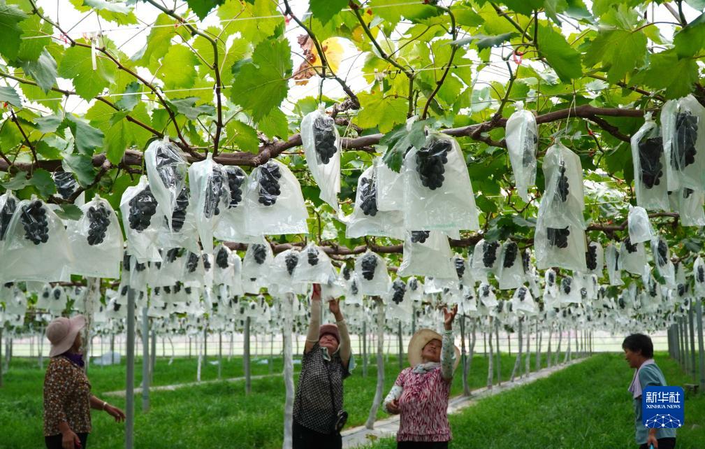 7月26日,在山東省新泰市樓德鎮(zhèn),果農(nóng)在高標(biāo)準(zhǔn)葡萄大棚里收獲成熟的葡萄。