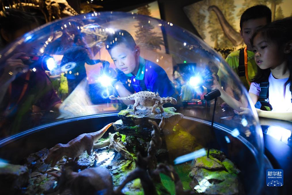 7月26日,參加夜游的孩子們在博物館內了解恐龍。