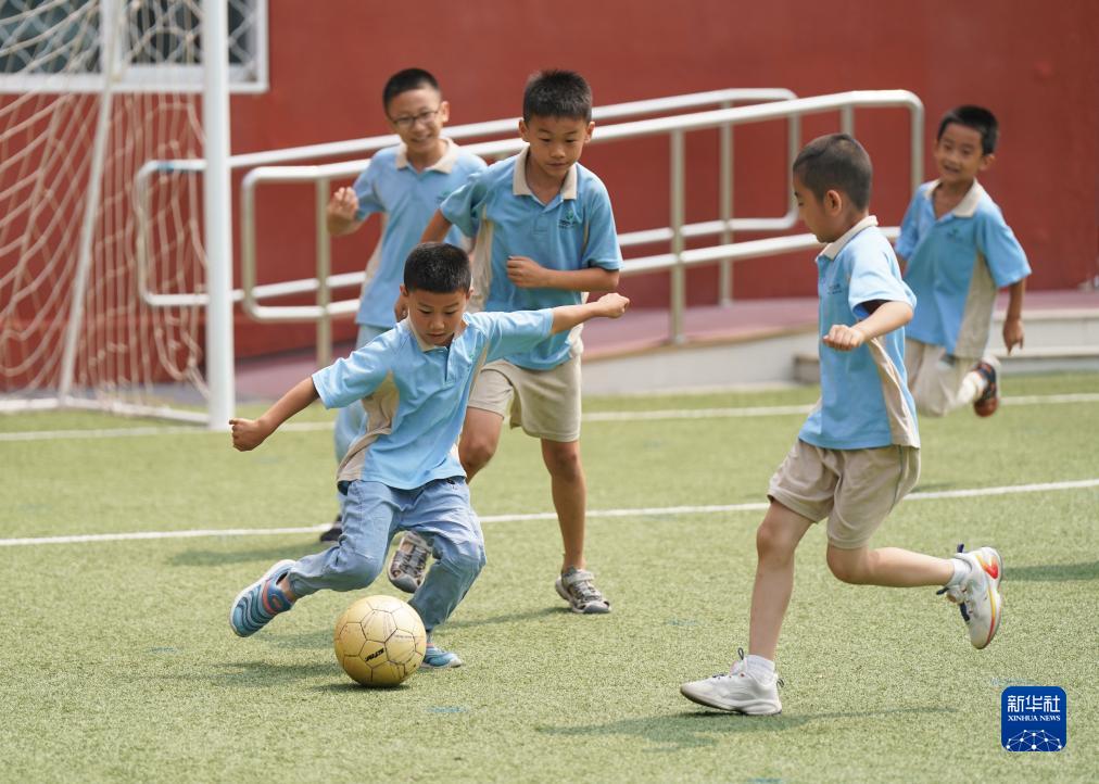 7月27日,在人大附中實驗小學(xué),參加暑期托管班的學(xué)生在踢足球。